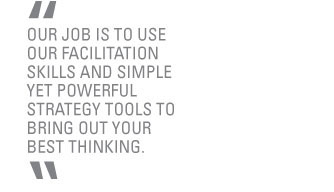 On the process side, I know that my clients are the experts on their industry and company. My job is to use my facilitation skills and simple yet powerful strategy tools to engage your entire team and bring out your best strategic thinking.